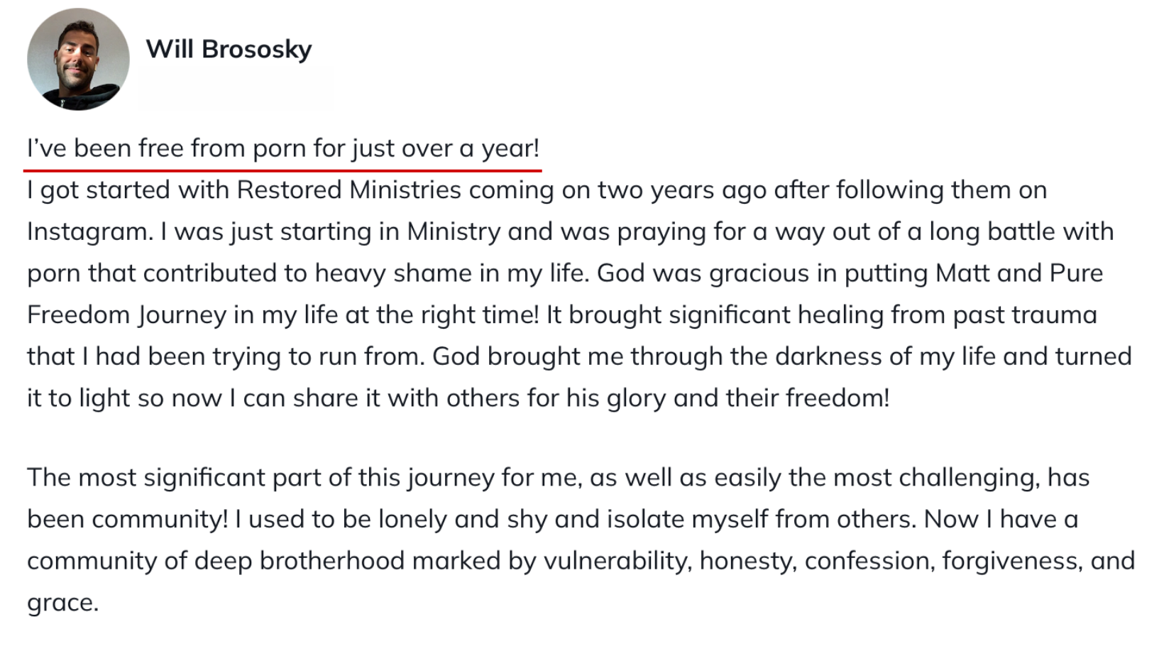 "My porn addiction deeply hurt my wife and we were separated for close to a year. In that time, Pure Freedom Journey was vital to help me gain victory and earn the trust of my wife. Now we’re back together and growing as a couple more than ever."