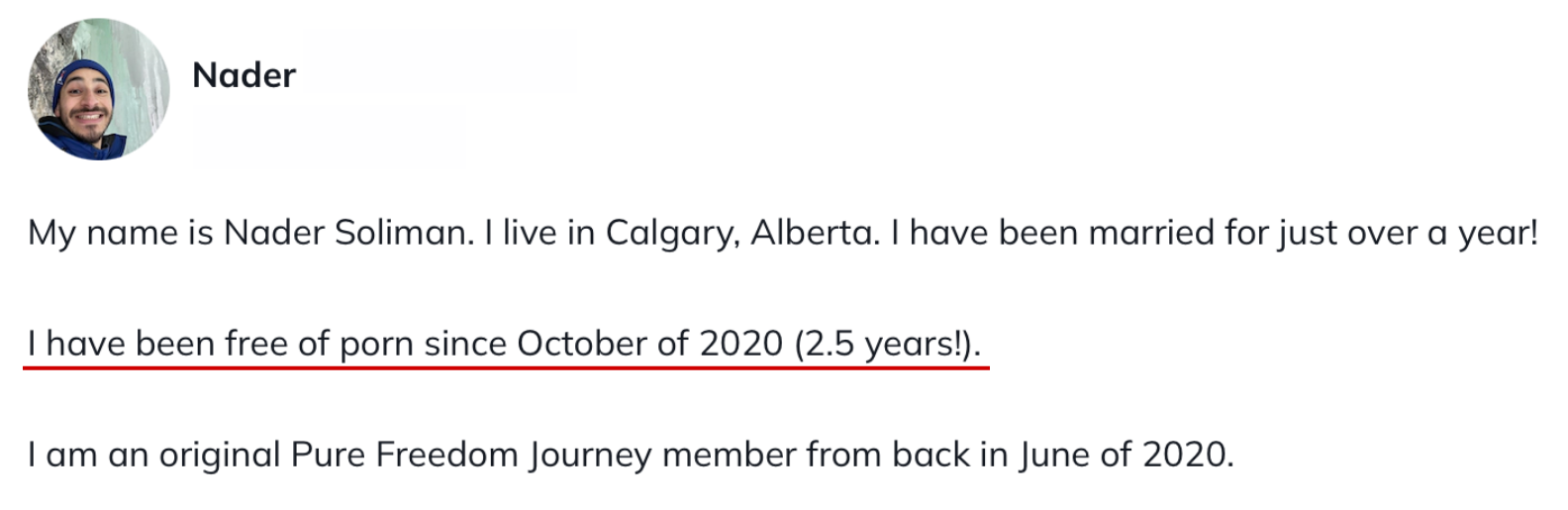 "I kept going back to porn and having flashbacks of past sexual encounters that plagued me. My wife put her foot down. We couldn’t find good in-person counselling and eventually found Pure Freedom Journey. Through this, I learned tools that have helped me so much. Now, I’m free of porn and free in my mind. It’s just amazing."